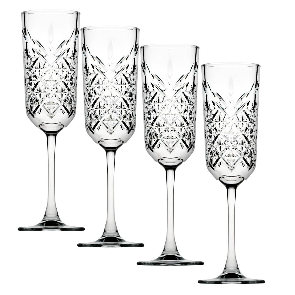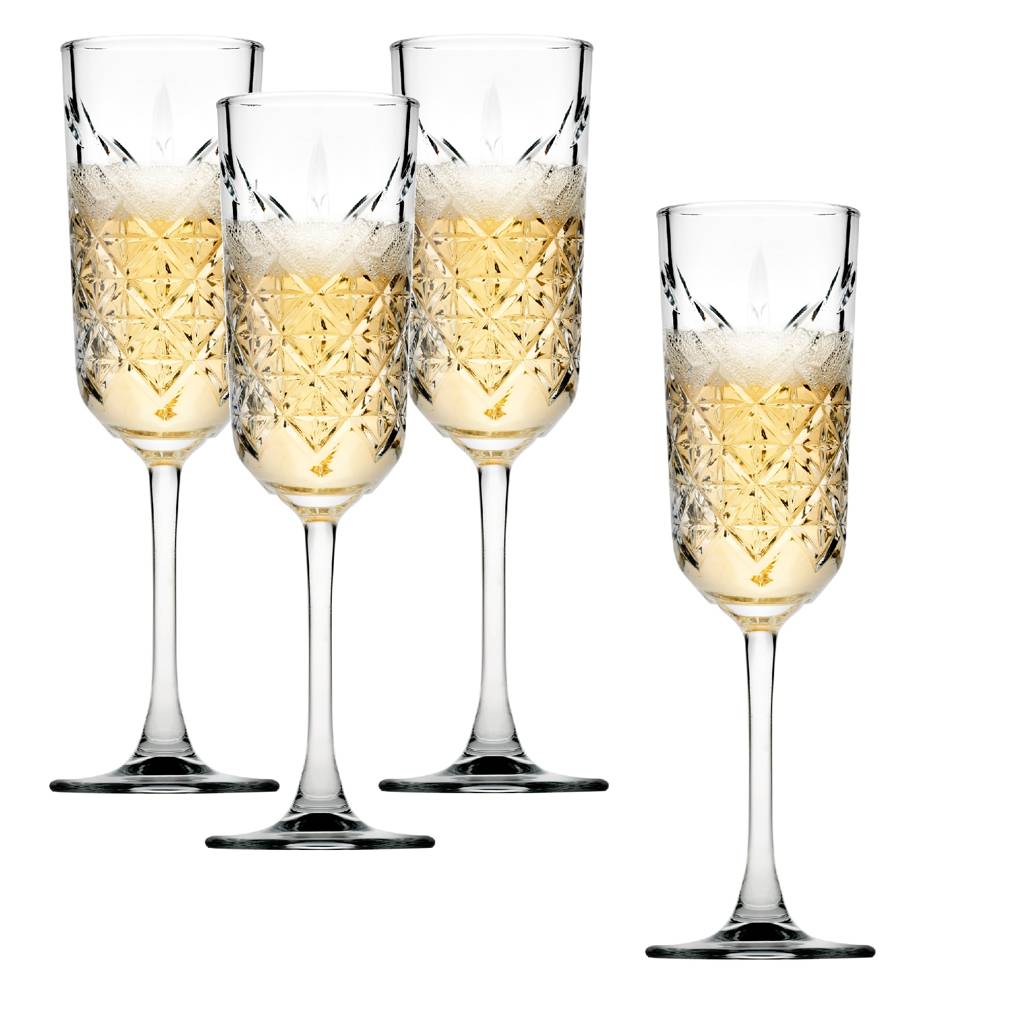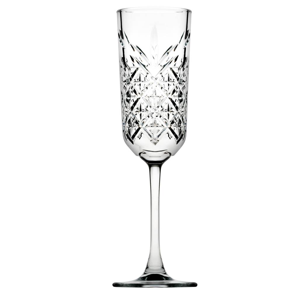The 175 ml glasses were designed for serving champagne and other sparkling wines. The characteristic cut glass pattern effectively scatters light and emphasizes the color of the beverage, giving it a unique presentation. The classic, elongated form ensures holding comfort and stability during use. The champagne glasses are dishwasher safe.