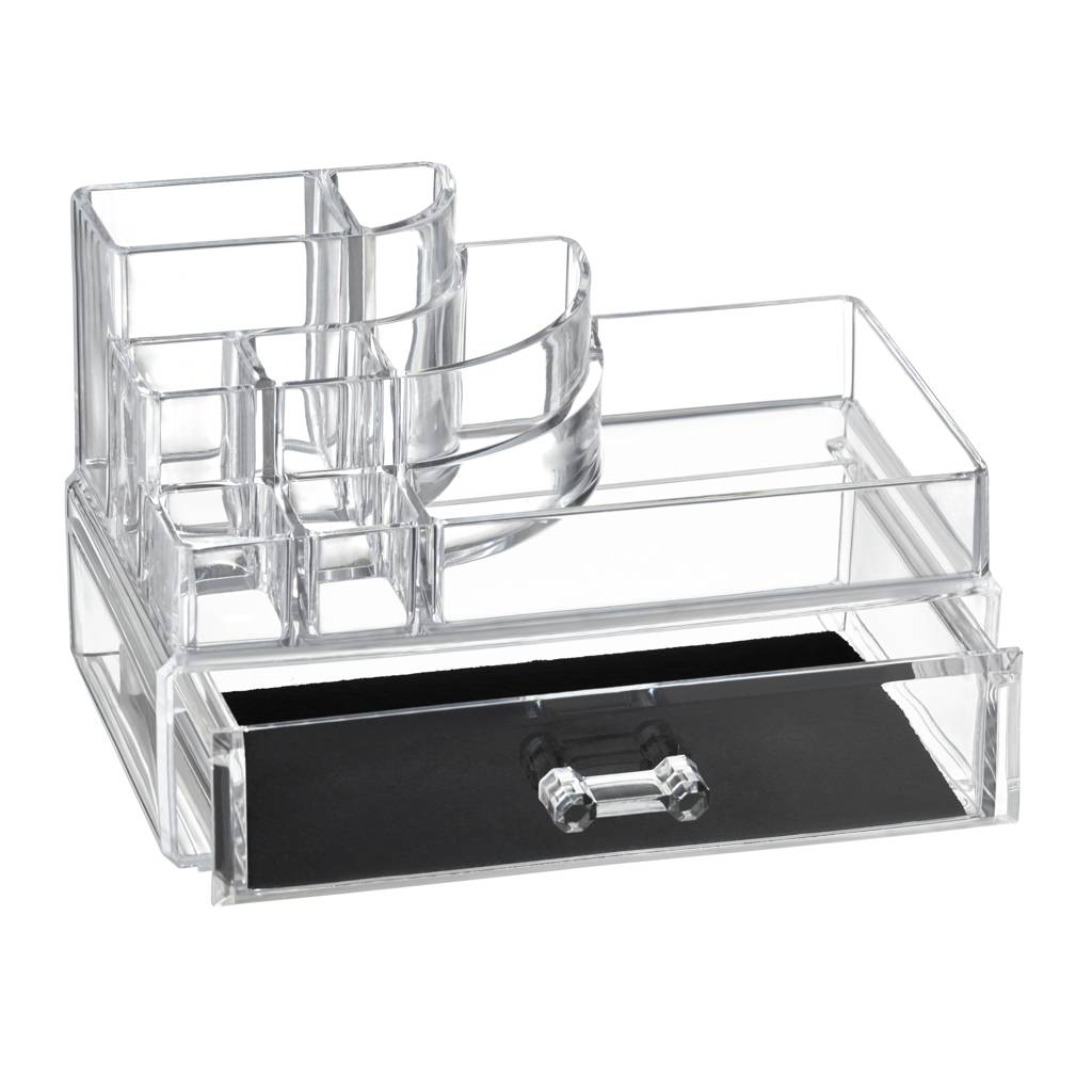 The transparent construction allows for a quick check of the contents, while the pull-out drawer with a comfortable handle helps maintain order and protects stored small items from dust. The organizer will work well on a dressing table, chest of drawers, or in the bathroom.