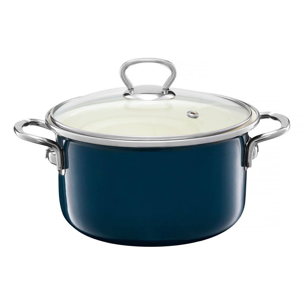 The body is made of steel covered with enamel, thanks to which the vessel is durable and safe in contact with food. This enamelled pot for induction heats up evenly and does not absorb odors or dyes, which makes it easier to keep clean. The matching lid supports cooking control, and the reinforced rim increases resistance to damage during daily use.