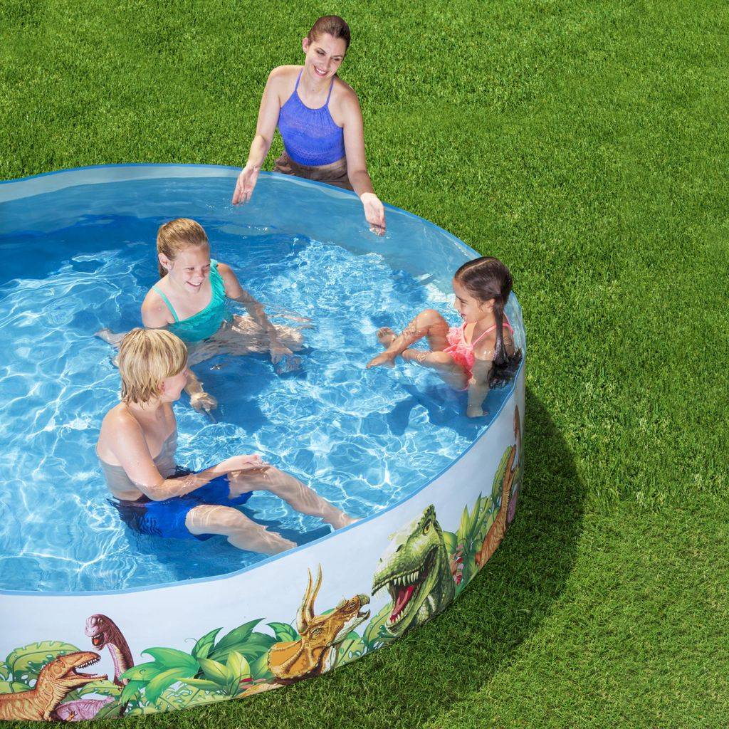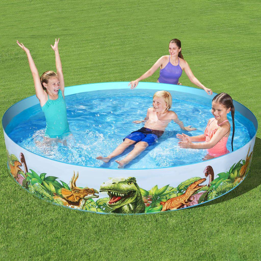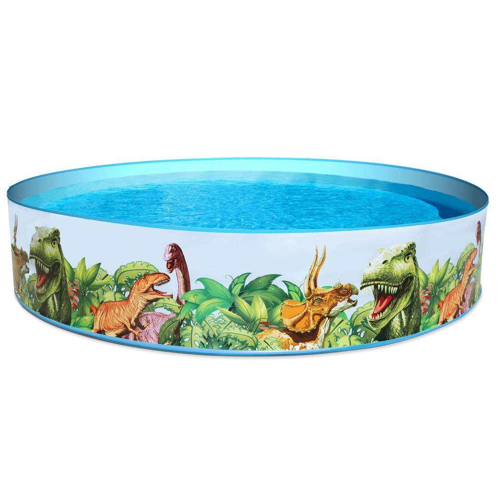 The pool is made of durable PVC with a reinforced structure that maintains its shape after being filled with water without the need for inflation. The expansion construction ensures stability and easy preparation for use, which makes the pool a practical solution during the summer season. The attractive, themed print with a dinosaur motif emphasizes the character of the product and encourages children to play.