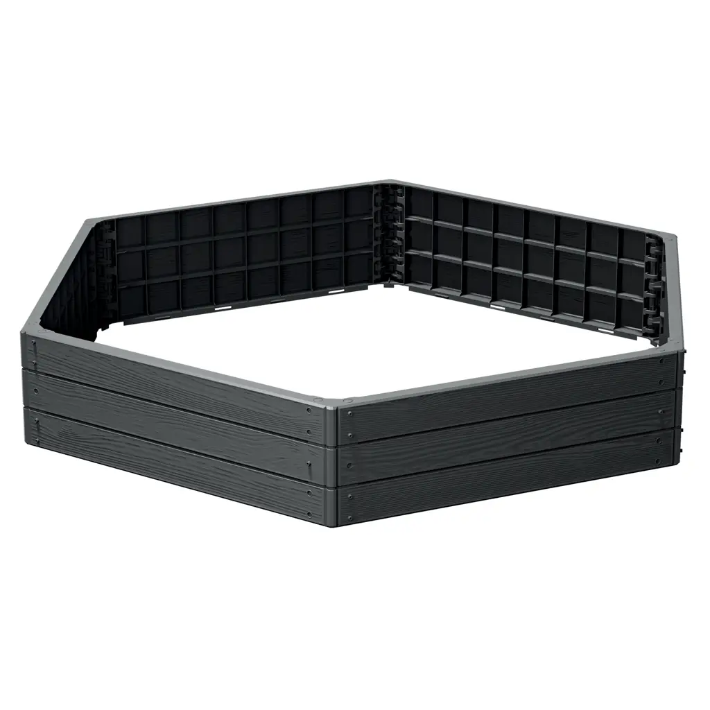 The model is made of durable plastic resistant to UV radiation, moisture, and changing weather conditions. The structure inspired by natural wood blends well with the garden arrangement, and the modular design allows for quick preparation of the bed for planting.