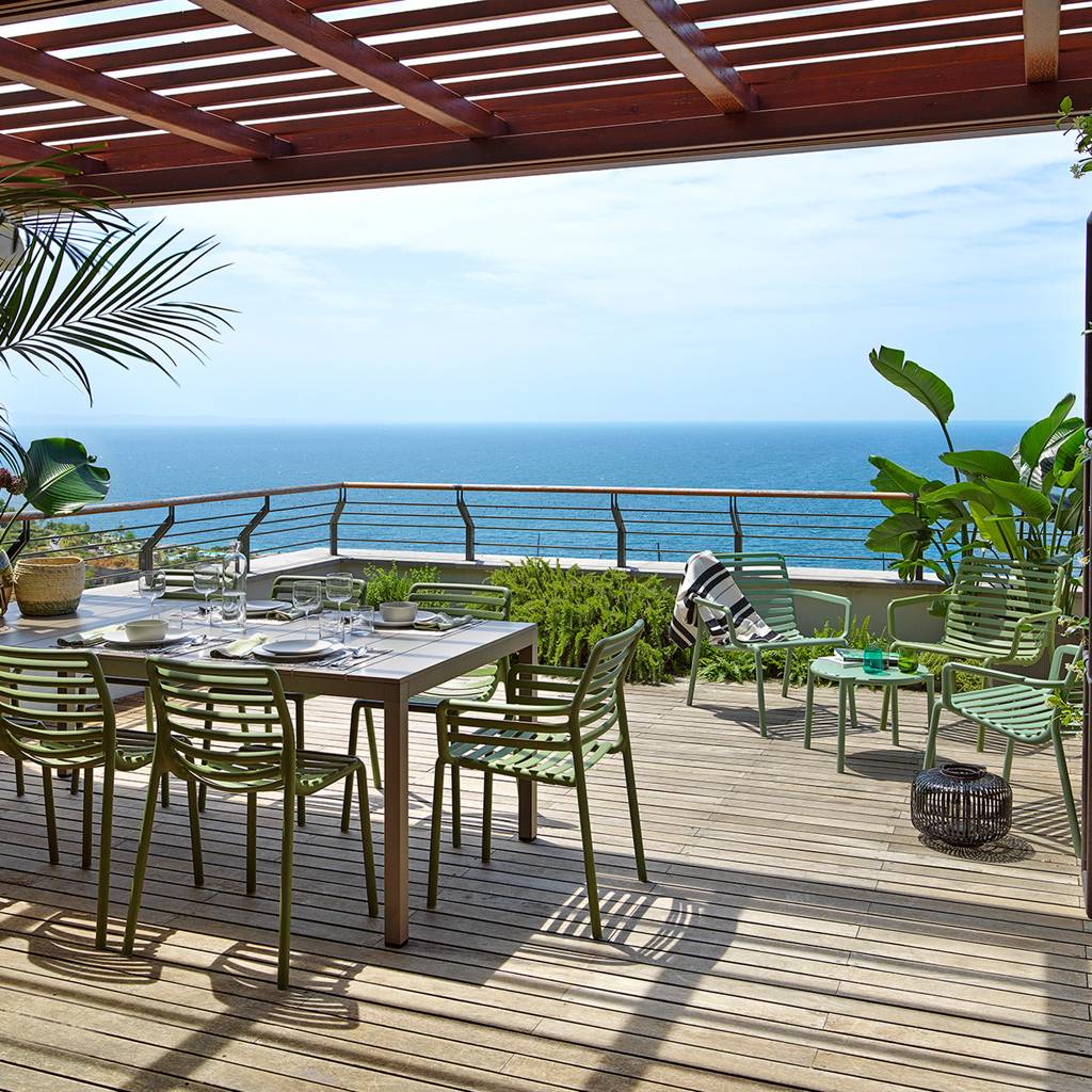 Table Rio is based on a durable aluminum construction protected by powder coating, and its top is made of high-quality synthetic resin, resistant to external conditions. The applied extension system allows for smooth enlargement of the table's usable surface without losing stability. Legs placed at the outer edges increase sitting comfort and provide more freedom under the top. Chairs Doga and Doga Bistrot are made of polypropylene reinforced with fiberglass, making them lightweight, durable, and well-prepared for outdoor use. Mass dyeing supports color durability, and the matte finish emphasizes the modern character of the set. Antistatic and anti-UV additives limit the impact of the sun and daily dirt, and the stackability makes storage easier. The entire set was manufactured in Italy, and European CATAS certificates confirm the standard of workmanship also for use in public spaces.