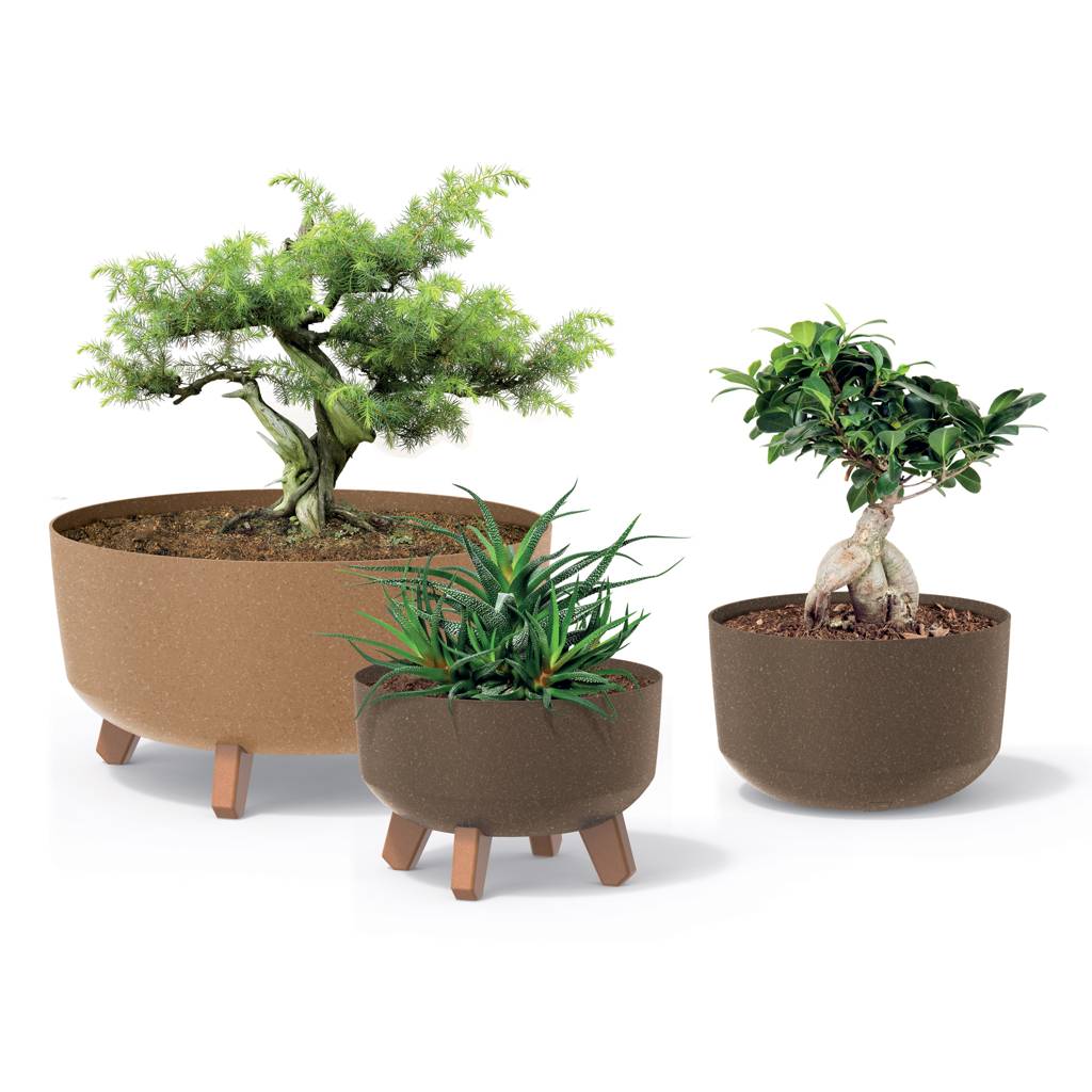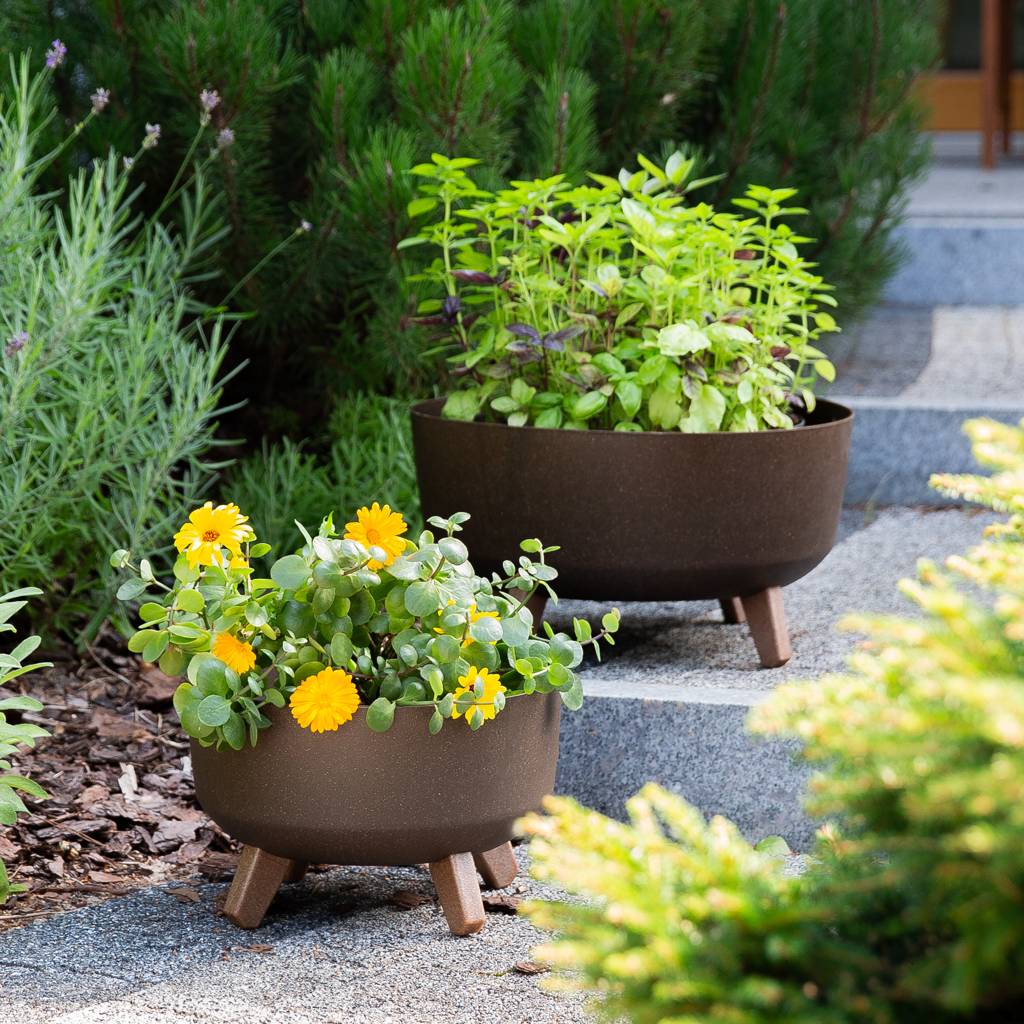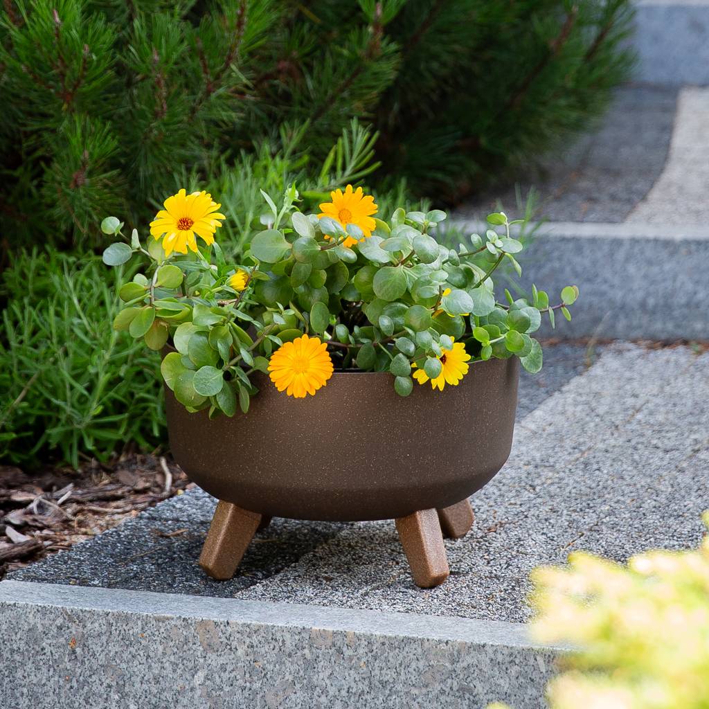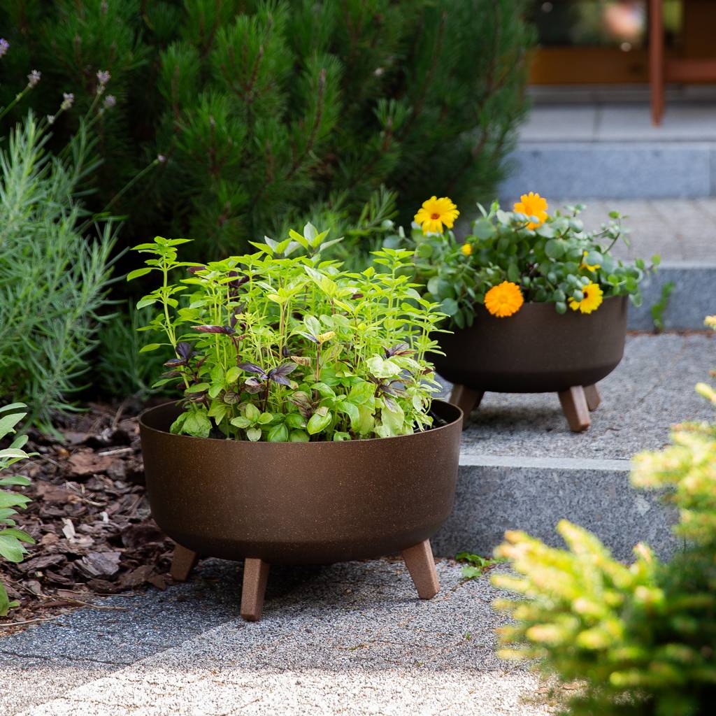The pot on legs Gracia Low Eco Wood Prosperplast in a smaller size is a practical solution for arranging balconies, terraces, and small garden spaces. The round, proportional form displays seasonal plants, herbs, and low decorative compositions well. This model works both individually and in combination with larger pots from the same collection.