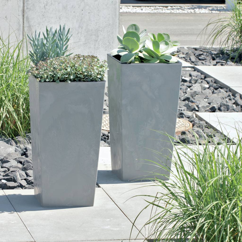 Garden pot with insert Urbi Square Beton Effect PROSPERPLAST is a modern proposal for arranging a terrace, balcony, and garden. The tall, square form combined with a structure inspired by concrete gives the space a minimalist, architectural character. Ideal for displaying ornamental grasses, shrubs, and expressive seasonal compositions.
