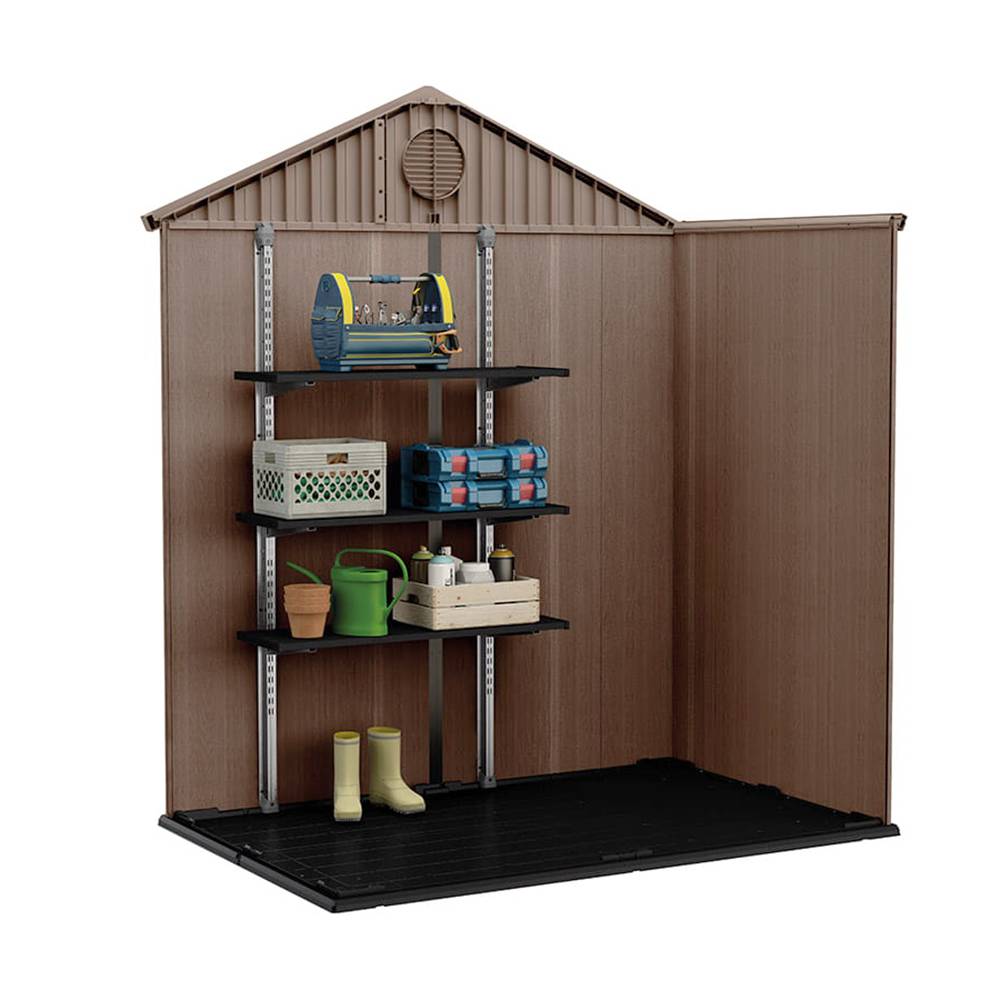 The structure is made of durable wood-textured composite and 16 mm thick double wall panels, which increases stability and resistance to weather conditions. The shed handles moisture, UV radiation, and variable temperatures well. Wide doors, a high ceiling, and a ventilation system ensure comfort of use, while the well-thought-out interior space facilitates the organization of stored items.