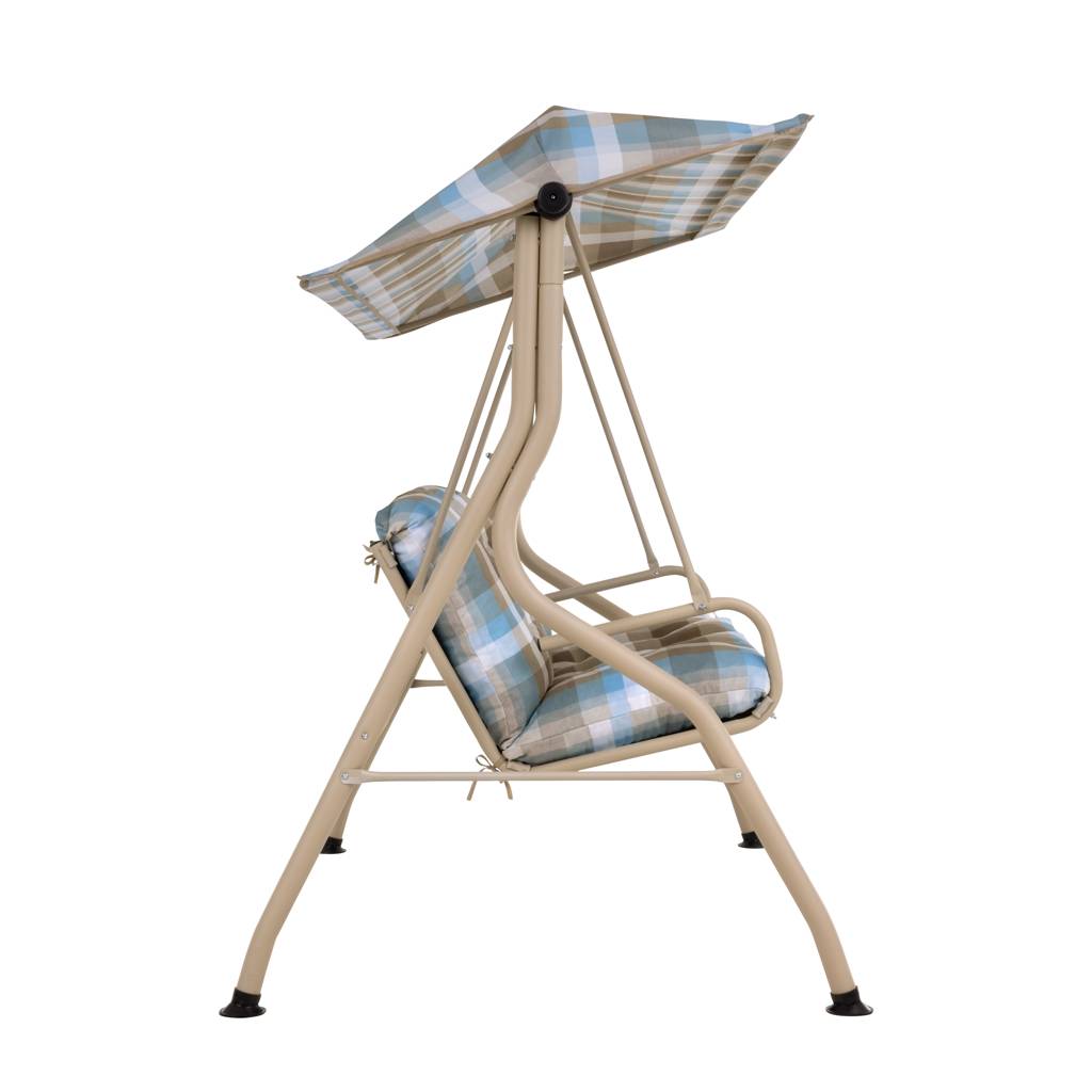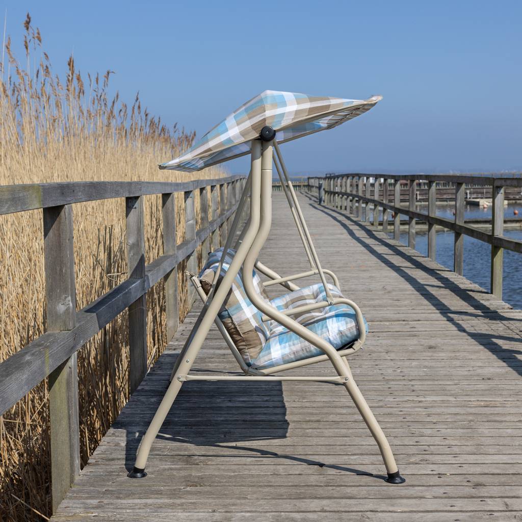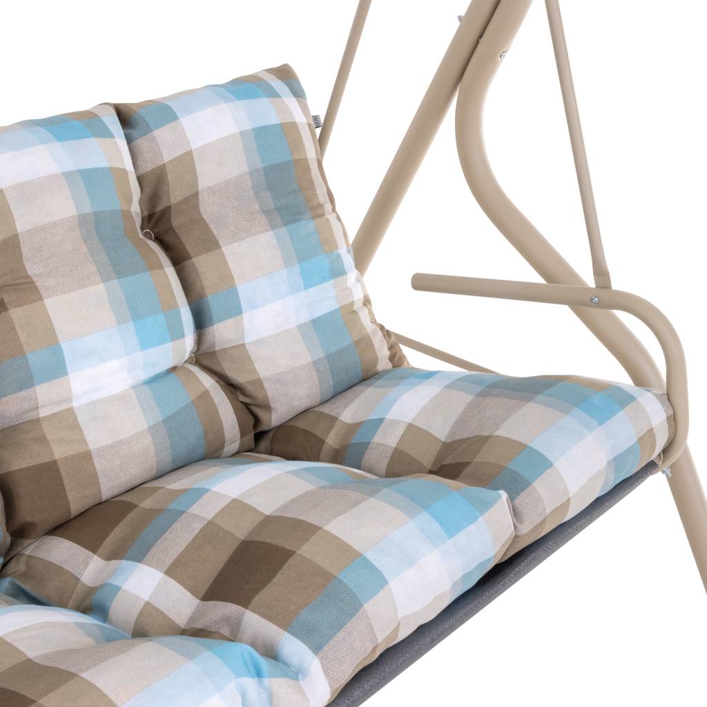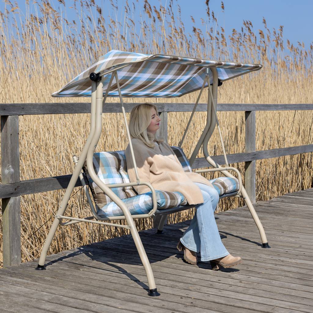 The construction of the terrace swing is based on a solid frame that ensures stability during use. The seat made of a durable PE base provides a lasting foundation for comfortable rest. The cushion set includes an element for the seat and backrest, filled with polyurethane foam scraps that provide elasticity and comfort. Quilting stabilizes the filling, and sewn-in ties allow the cushions to be attached to the structure. The canopy made of fabric protects against the sun and increases the comfort of use, while the piping finish enhances the aesthetics of the entire form. The garden swing combines functionality, durability, and comfort, meeting the needs of garden space users.