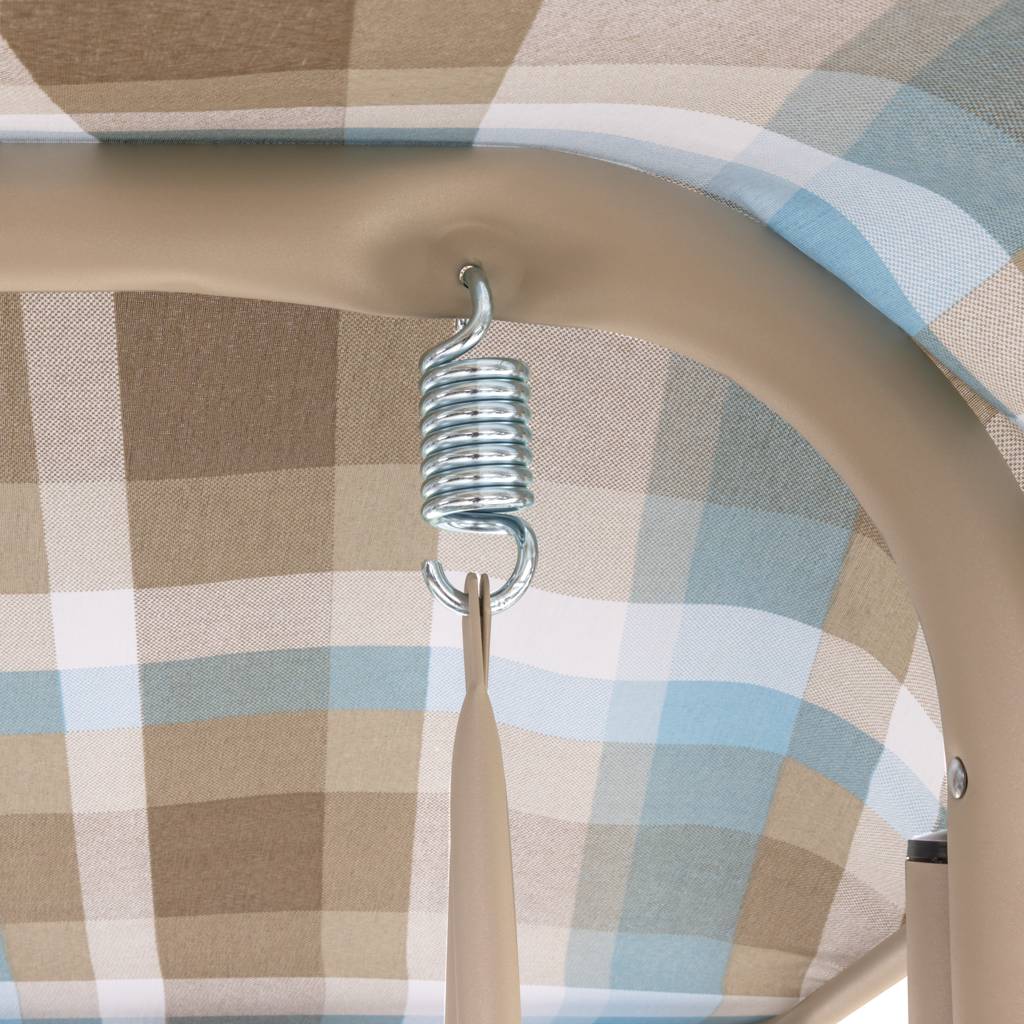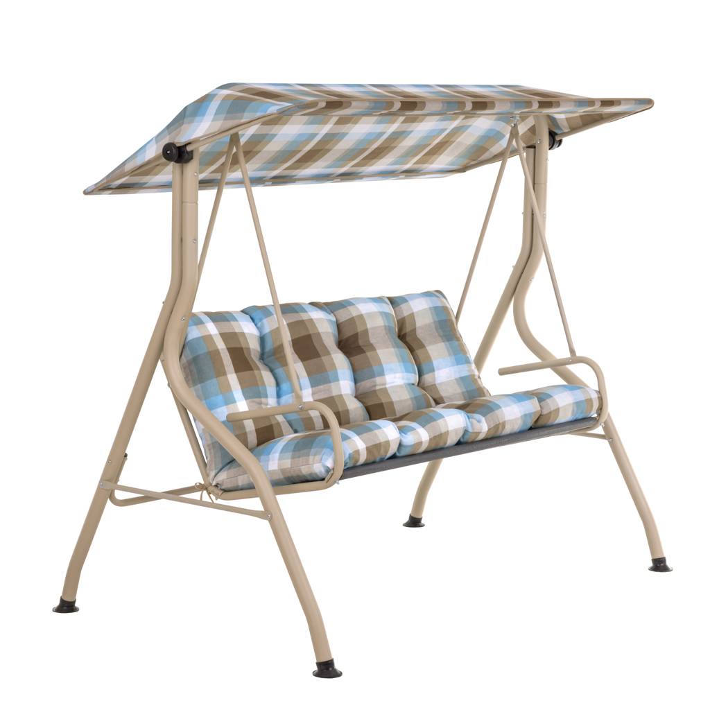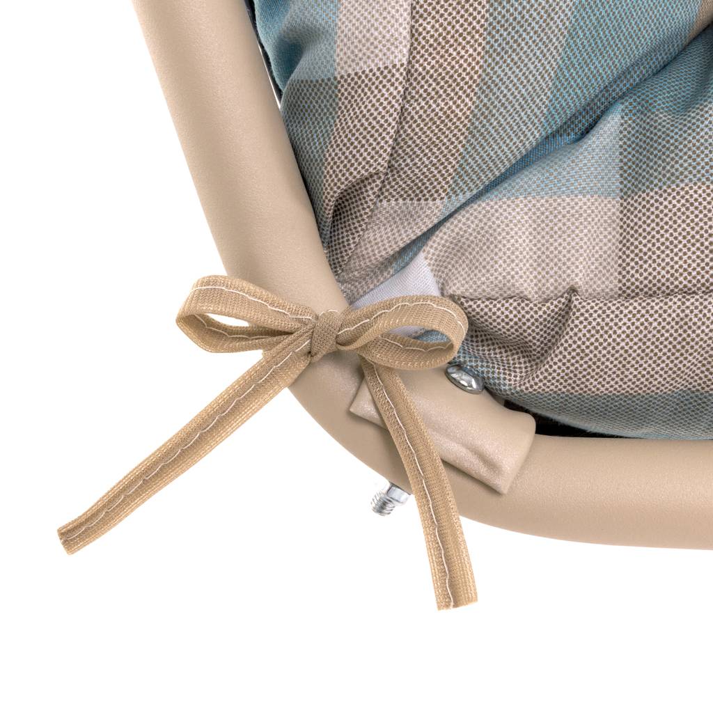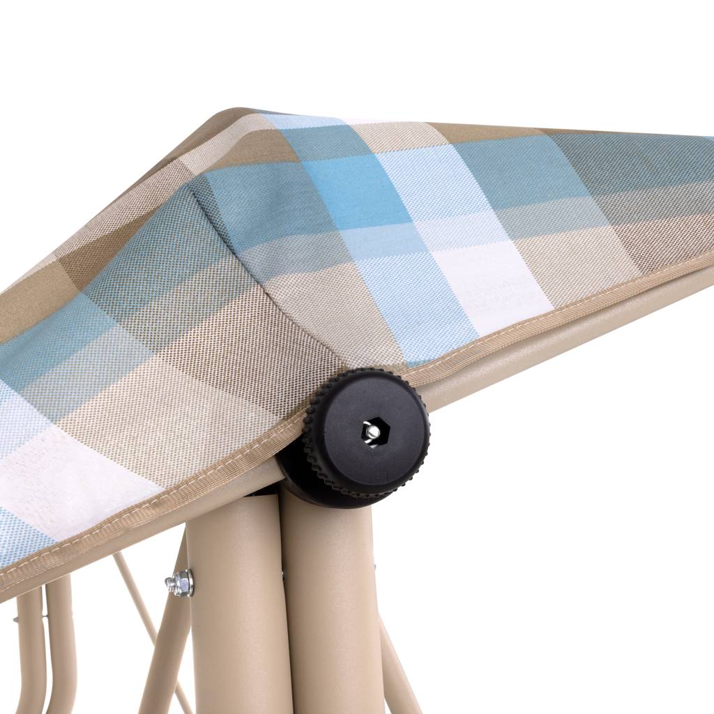 The construction of the terrace swing is based on a solid frame that ensures stability during use. The seat made of a durable PE base provides a lasting foundation for comfortable rest. The cushion set includes an element for the seat and backrest, filled with polyurethane foam scraps that provide elasticity and comfort. Quilting stabilizes the filling, and sewn-in ties allow the cushions to be attached to the structure. The canopy made of fabric protects against the sun and increases the comfort of use, while the piping finish enhances the aesthetics of the entire form. The garden swing combines functionality, durability, and comfort, meeting the needs of garden space users.