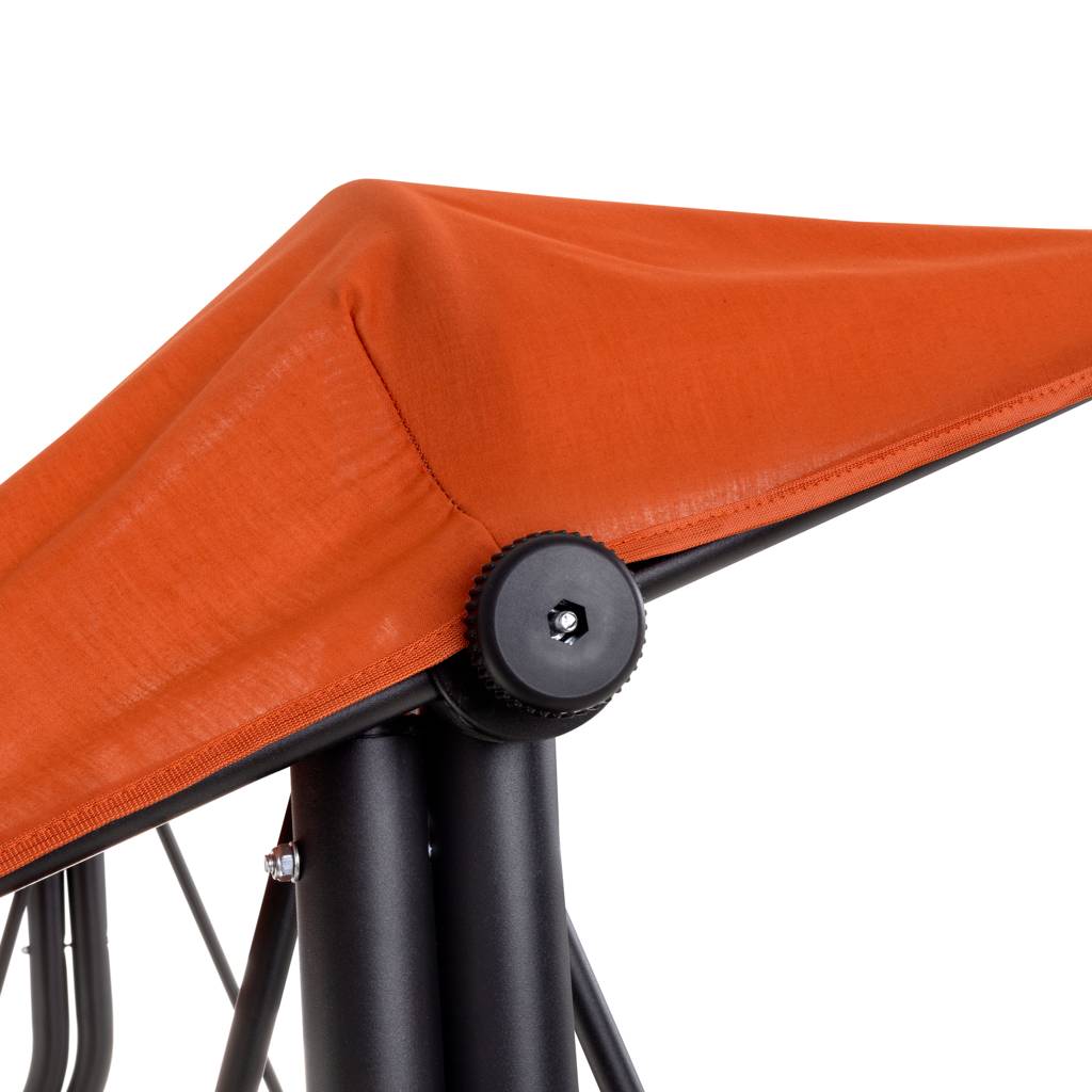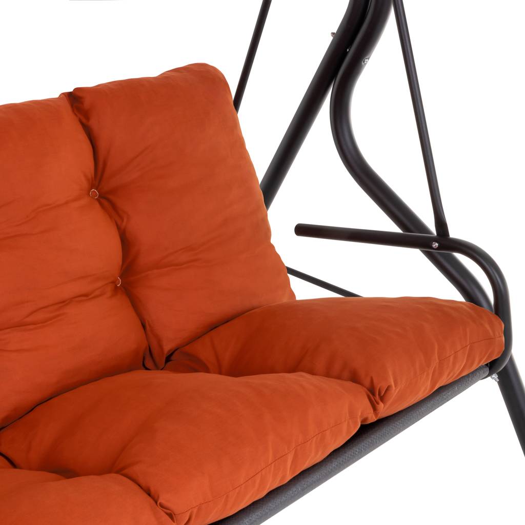 The construction of the terrace swing is based on a solid frame that ensures stability during use. The seat made of a durable PE base provides a lasting foundation for comfortable rest. The cushion set includes an element for the seat and backrest, filled with polyurethane foam scraps that provide elasticity and comfort. Quilting stabilizes the filling, and sewn-in ties allow the cushions to be attached to the structure. The canopy made of fabric protects against the sun and increases the comfort of use, while the piping finish enhances the aesthetics of the entire form. The garden swing combines functionality, durability, and comfort, meeting the needs of garden space users.
