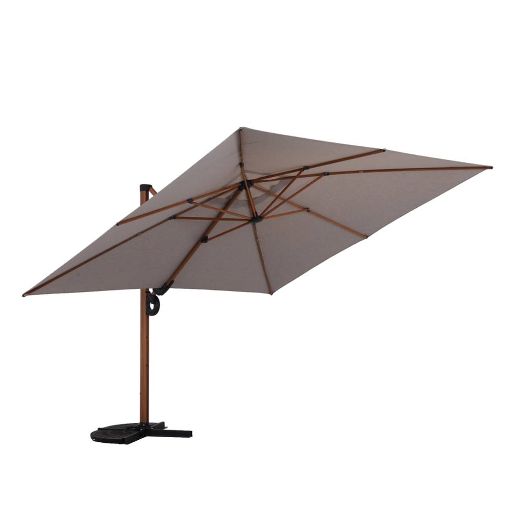 The construction is based on a solid steel frame with an increased cross-section, powder-coated in a finish imitating wood, which combines durability with aesthetics. The canopy made of high-grammage polyester ensures effective sun protection and resistance to daily use. The adjustment mechanism allows for both changing the tilt angle and a full 360° rotation, which significantly increases functionality. The stable cross base allows for safe use after appropriate weighting.