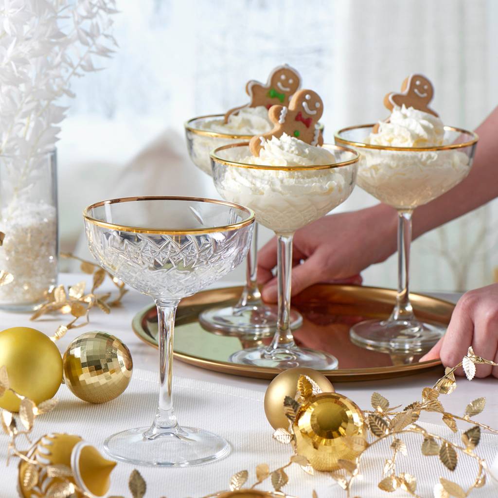 The set of champagne glasses Timeless is a proposal for people who appreciate the effective presentation of cocktails and refined details on the table. The expressive coupe form combined with decorative embossing gives the glasses a unique, bar character. The wide, open bowl allows for the aesthetic serving of champagne as well as cocktails such as martini, daiquiri or drinks based on sparkling wines. The glass structure inspired by crystal cutting effectively scatters light and emphasizes the color of the drink. The slender stem and stable base ensure comfort of holding and safety of use. The model is available in two finishing variants, which allows you to match the glasses to the style of the table arrangement or the character of the party.