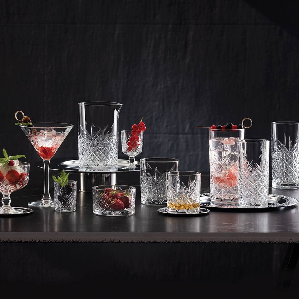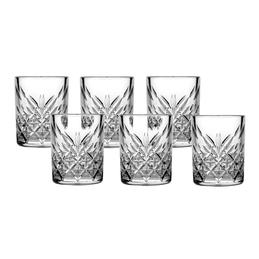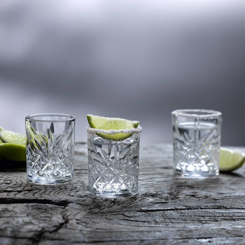The set of vodka glasses from the Timeless collection is an elegant proposal inspired by classic crystal cutting. The decorative pattern effectively scatters light and emphasizes the character of the served spirits. It is a choice valued both in home bars and in professional gastronomy.