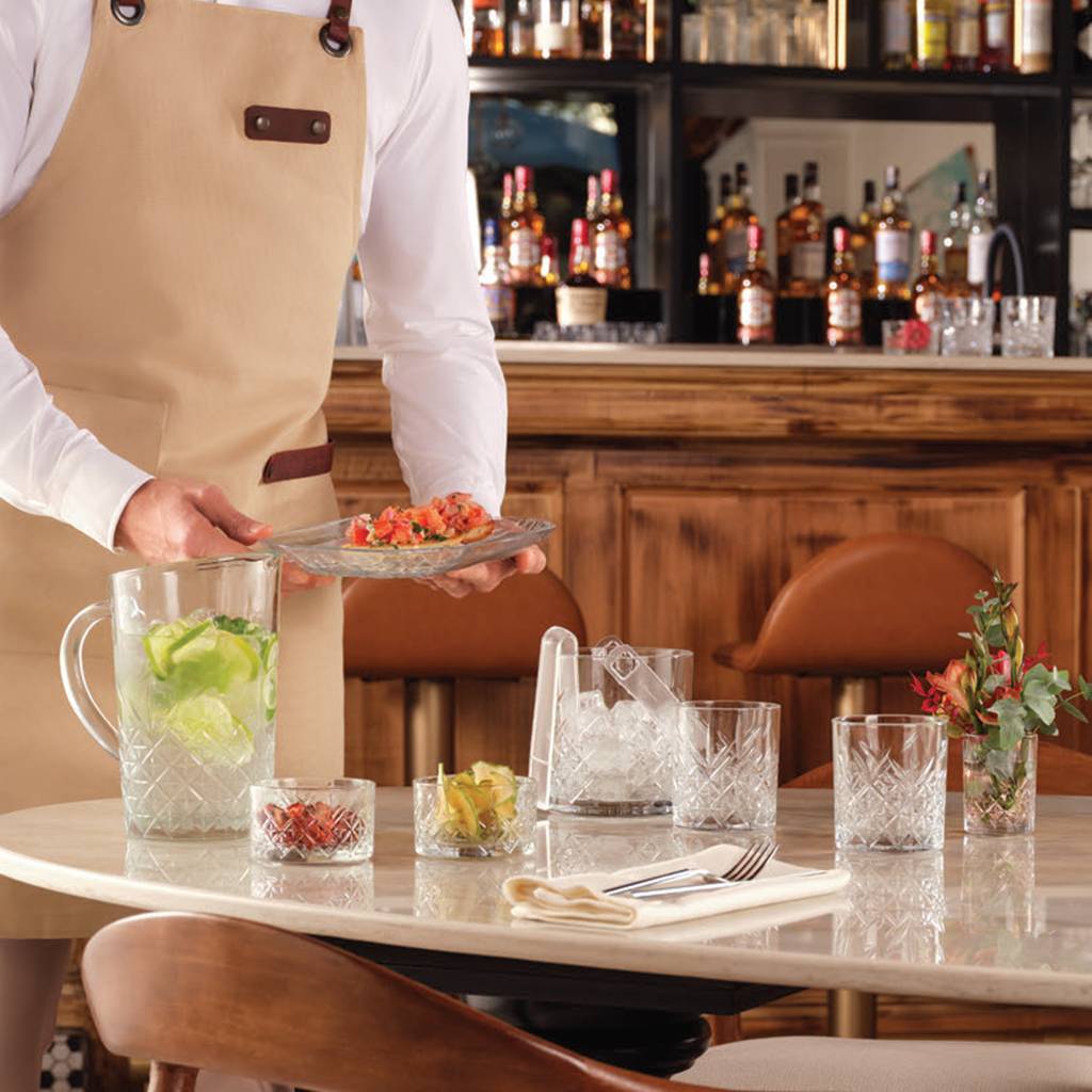 The embossed pattern effectively scatters light and emphasizes the contents of the glass. The decorative structure gives the tableware an elegant, expressive character.