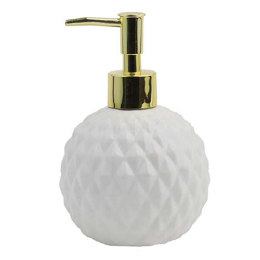 The Lavado soap dispenser in white is a stylish and functional accessory that will transform any bathroom. Made of dolomite, a durable ceramic, it impresses with its decorative structure and subtle shine. The rounded body combined with a shiny, gold pump creates a unique accent that catches the eye and gives the interior character. The product is ideal for dispensing liquid soap, lotion, or hand sanitizer. Its universal form blends perfectly with other elements from the Lavado series, creating a coherent bathroom set.
