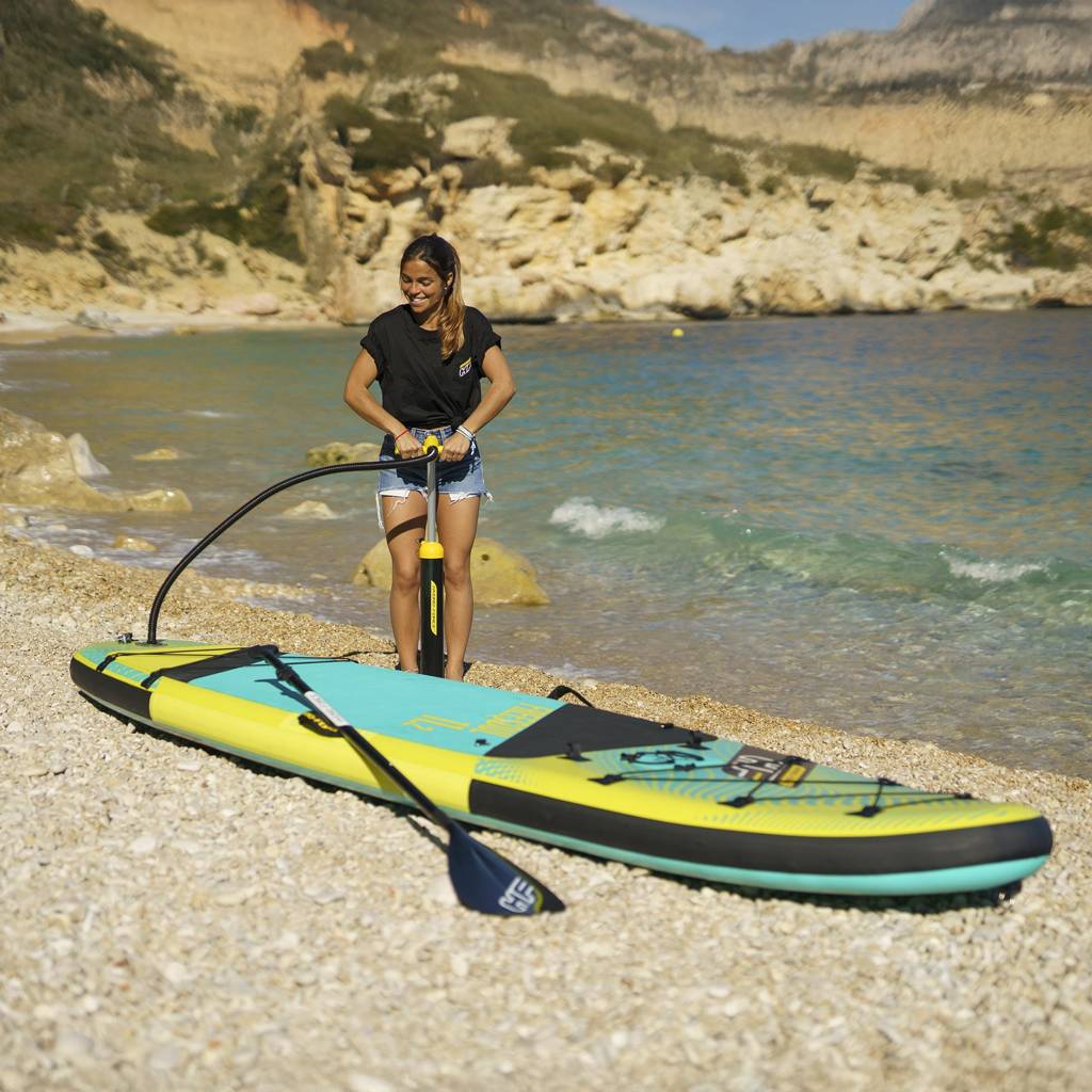 Choose equipment that adapts to your swimming style and daily plan. This SUP board with kayak function combines stability, durability, and comfort of use, allowing you to freely explore lakes, bays, and calm rivers. With one move, you can change recreational stand-up paddling into a comfortable, seated form of swimming. The construction based on FortiFiber™ Drop Stitch technology and Tritech® reinforcements ensures high stiffness after inflation and resistance to mechanical damage. The non-slip deck surface increases grip and control during maneuvering. Thanks to the detachable kayak seat and footrest, the board turns into a stable kayak in a few moments, and the adjustable paddle can be extended up to 217 cm or converted into a model with a double blade. The double pump allows for quick preparation of the board for swimming, and after finishing the activity, the entire set fits into a lightweight deluxe backpack.
