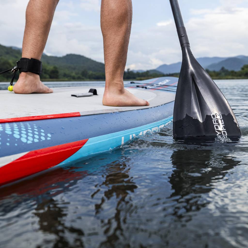 The reinforced internal structure ensures board stiffness and stability on the water while maintaining a lightweight, inflatable design.
