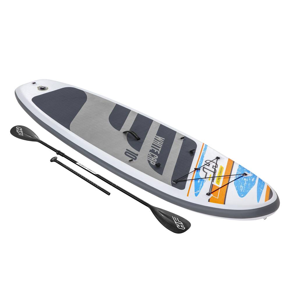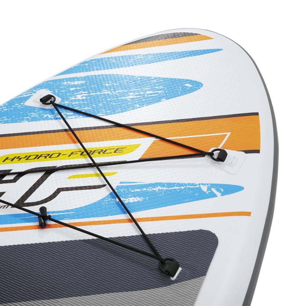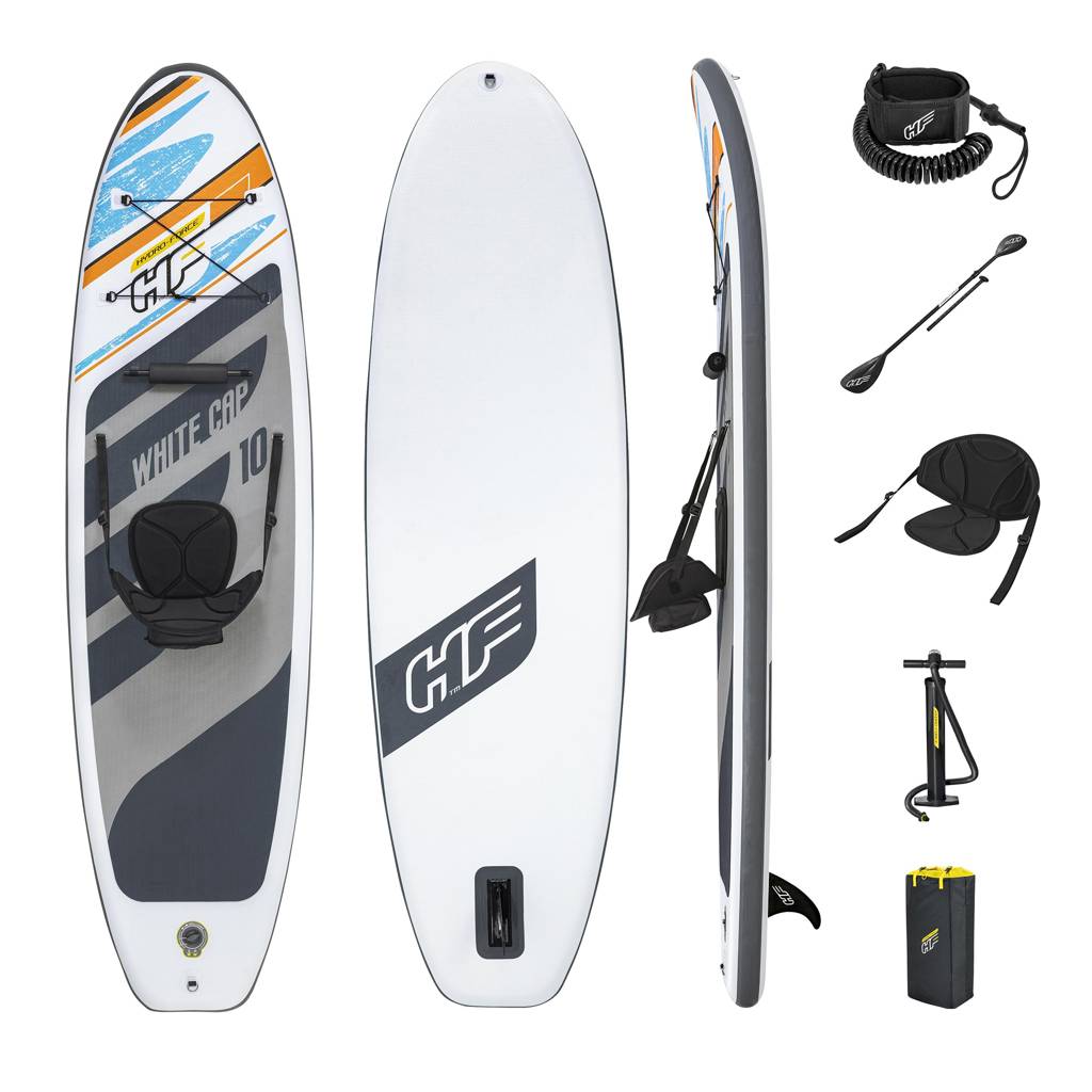 The SUP board Hydro Force® White Cap Set is the perfect solution for water sports enthusiasts, combining the functionality of a SUP board and a kayak. Thanks to FortiFiber™ Drop Stitch technology, the board is characterized by exceptional durability, stiffness, and stability. The set includes a kayak seat, a footrest, and an adjustable paddle that can be adapted for both stand-up paddling and sitting. A maximum load capacity of 120 kg and a versatile design make the board suitable for both flat waters and light waves. A compact backpack allows for easy transport, and a quick valve allows for instant inflation and deflation of the board.