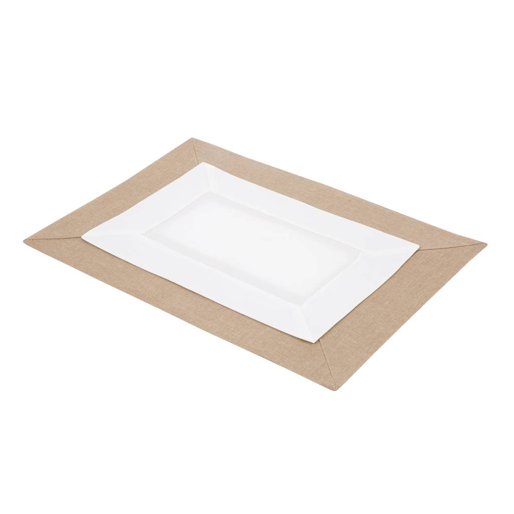 The Duo table mat is an aesthetic addition to table arrangements, combining a light surface with a warm accent of a beige border. This contrast emphasizes the shape of the mat and makes it a subtle decorative element during daily meals and gatherings at the table.