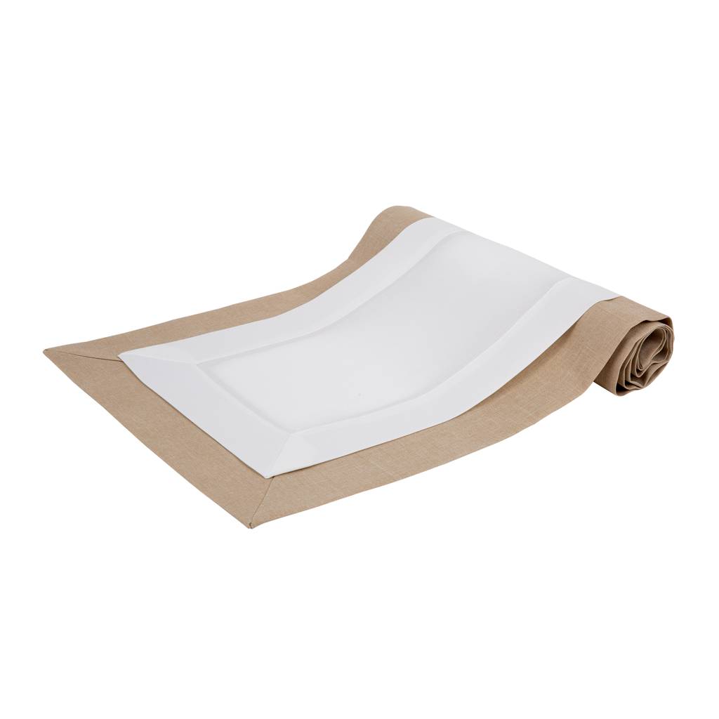 The Duo table runner is a stylish decorative element that introduces calm, natural colors to the table arrangement. The combination of a light center with a beige border creates a harmonious contrast, making the table runner a distinct but subtle decorative accent.