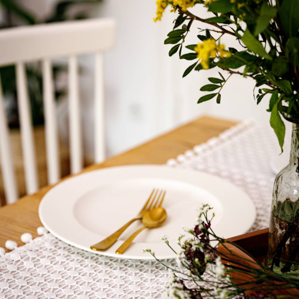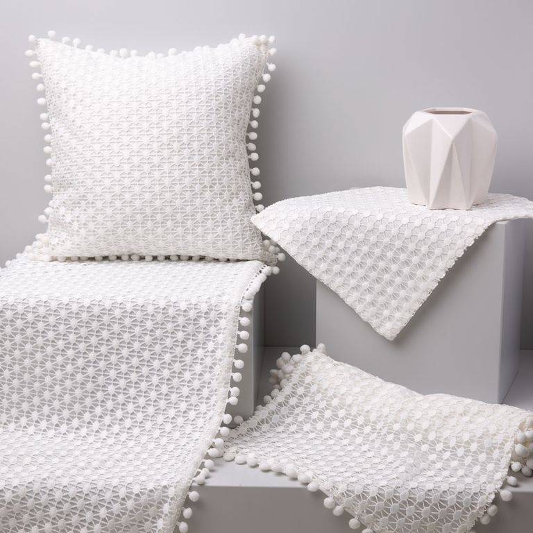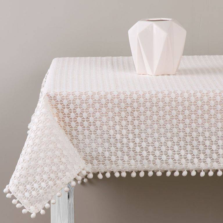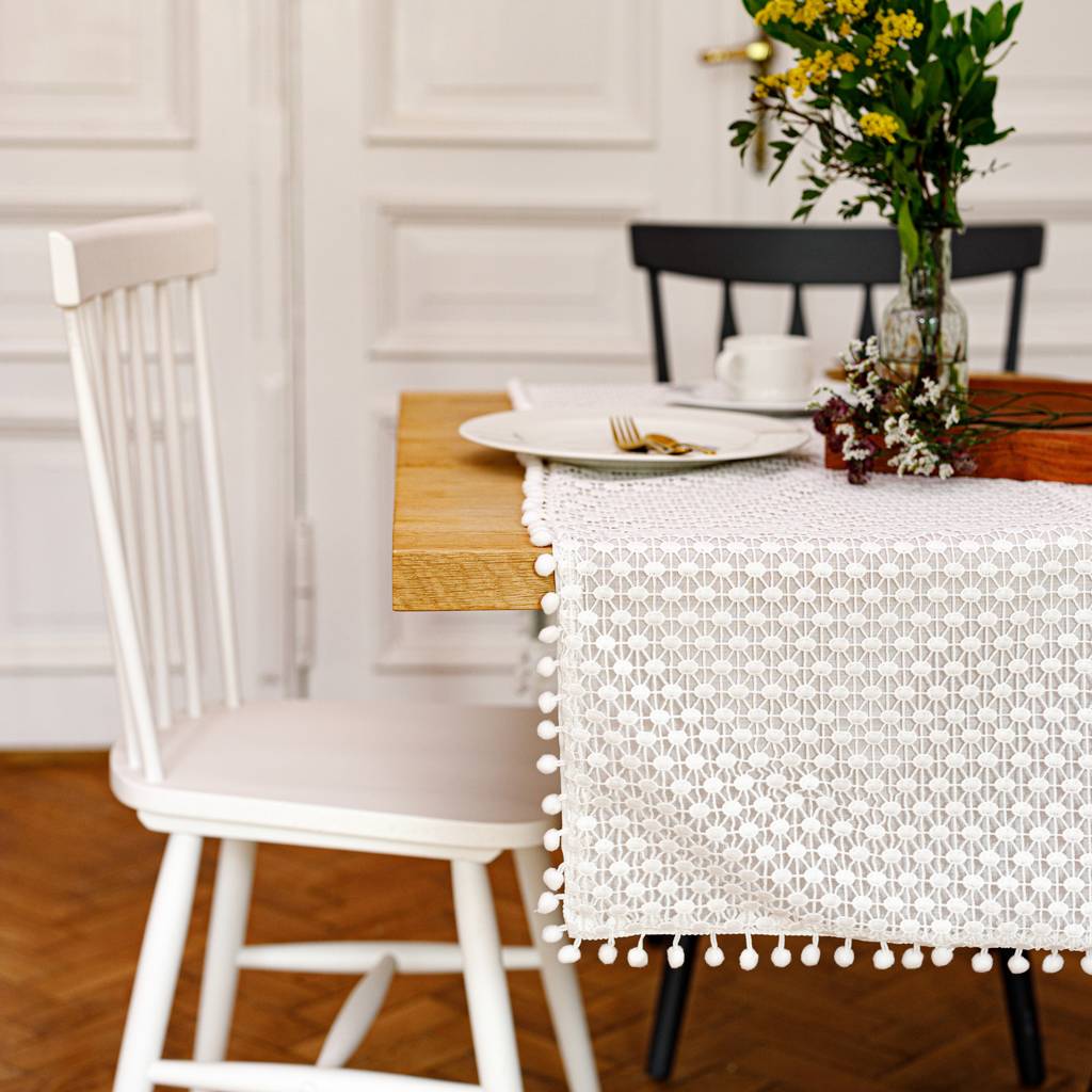The rectangular tablecloth is a stylish table decoration that is perfect for both everyday use and special occasions. Delicate guipure and decorative pom-poms on the finish give it lightness and a unique character, making it look beautiful in the dining room, kitchen, or living room.