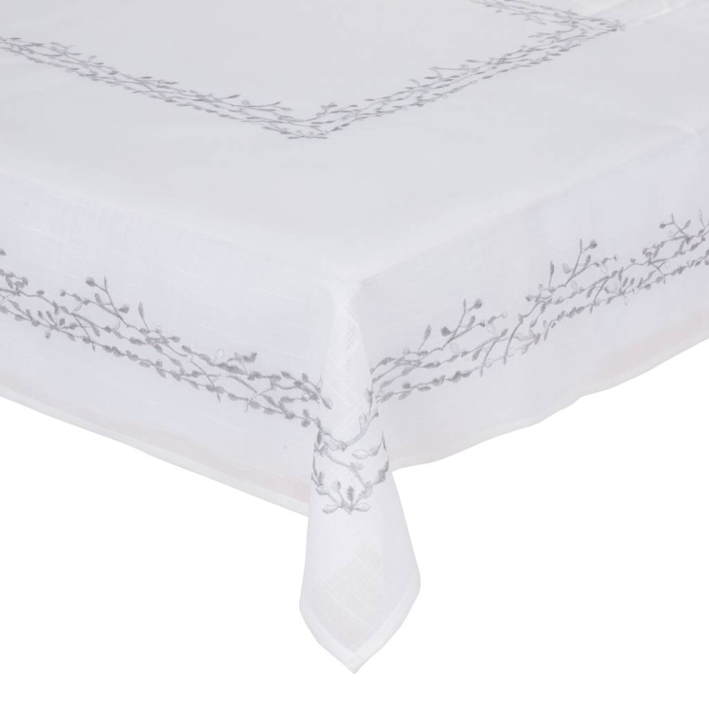 The Silver Garden tablecloth introduces a subtle decorative accent inspired by nature to the table arrangement. Delicate embroidery with a floral motif creates a decorative frame for the tableware, giving the entire table composition a distinctive character. This is a proposal that will work well both during family meals and on special occasions.
