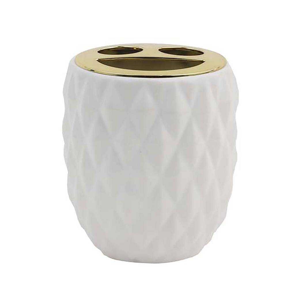 Stylish cup Lavado is a functional element of bathroom equipment that attracts attention with its form and finish. The white surface with diamond embossing has been combined with a striking gold overlay with holes, which not only facilitates the organization of toothbrushes but also adds a unique character to the whole. The cup is made of durable dolomite ceramics – resistant to moisture and easy to clean. Thanks to its elegant form, it fits perfectly into modern and classic interior arrangements.