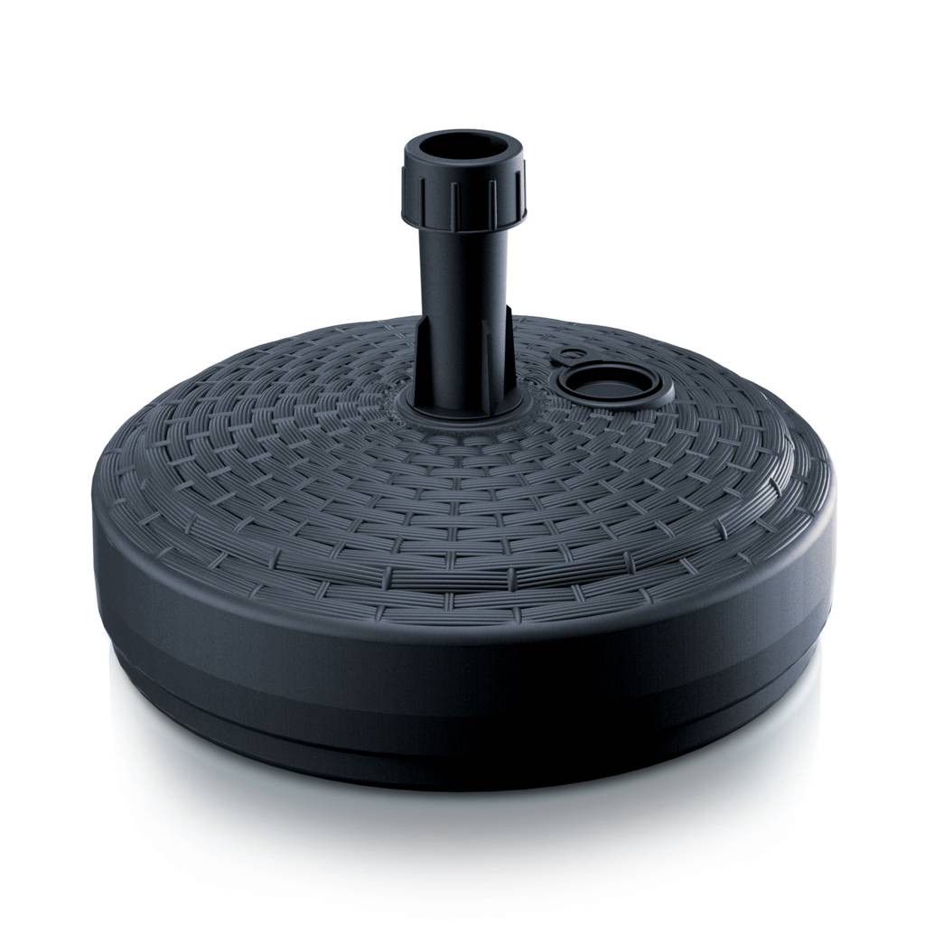 The umbrella base is made of durable material resistant to weather conditions. It can be filled with sand and water or gravel, which increases weight and stability during use. The universal stem allows for fitting most umbrellas available on the market. An additional advantage is the surface with a decorative structure inspired by rattan, which enhances the aesthetics of the product and fits into modern garden arrangements.