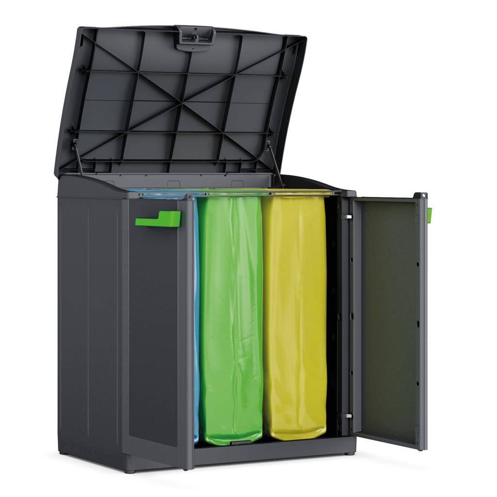 Forget about the mess associated with waste segregation. The Moby recycling container by Keter is a neat and compact solution that will bring order to your home. Thanks to its thoughtful design, the waste container allows for convenient storage of waste in three separate bags with a capacity of 110 L each, maintaining aesthetics and order. Solid construction, modern design in grays and durable materials make this container not only functional, but also an attractive element of equipment.
