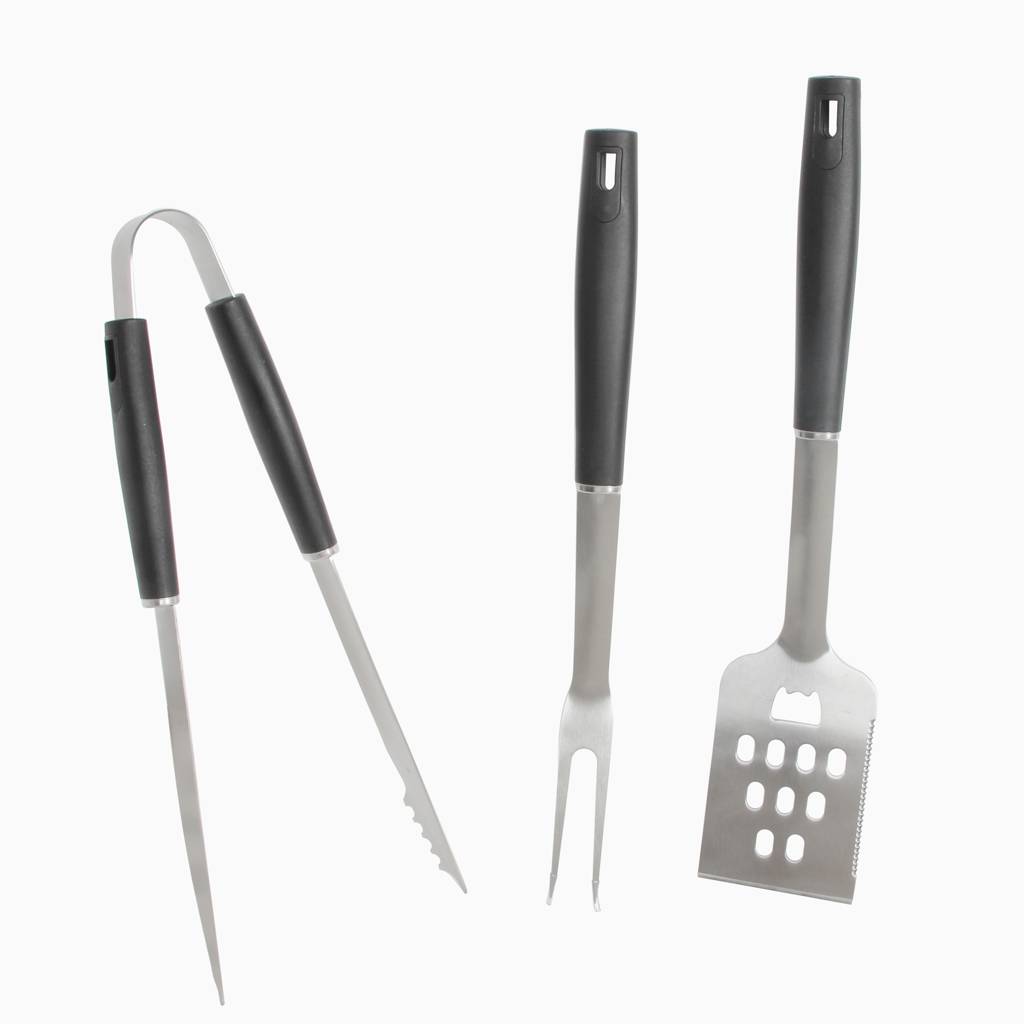 The set includes tongs, a spatula, and a meat fork, allowing you to conveniently prepare various dishes. This ensures all necessary tools are always at hand.