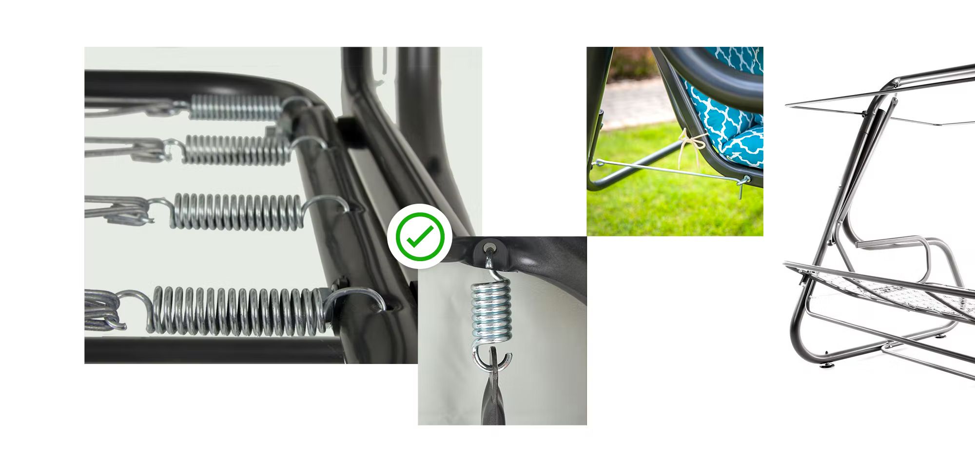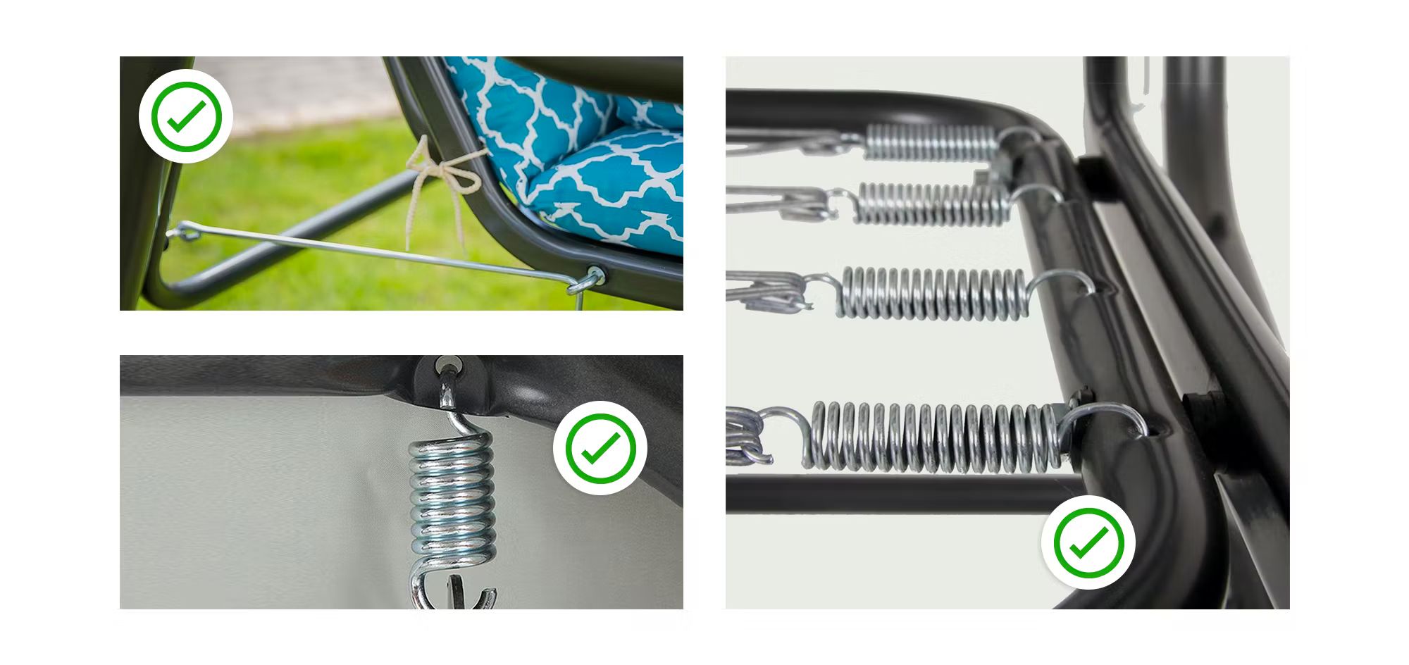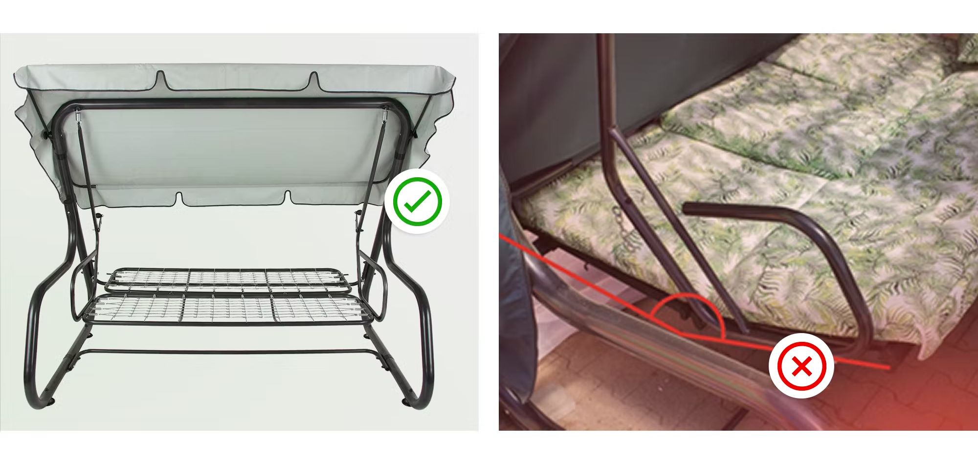 A properly profiled seat and backrest, along with appropriately selected cushions, will provide full comfort during relaxation. Make sure that you do not slide off the seat while sitting or swinging. It is important not to feel pressure under the knees (in the lower legs) while using the garden swing. In the case of excessive pressure, circulation in the lower limbs is disrupted and can adversely affect your health. Avoid stiff, wire, welded meshes and sheet metal strips in the seat construction. Ensure that the cushions are thick enough so that you do not feel the seat frame underneath them. Patio garden swings are equipped with thick seat cushions, and their seat construction is most often spring-based.