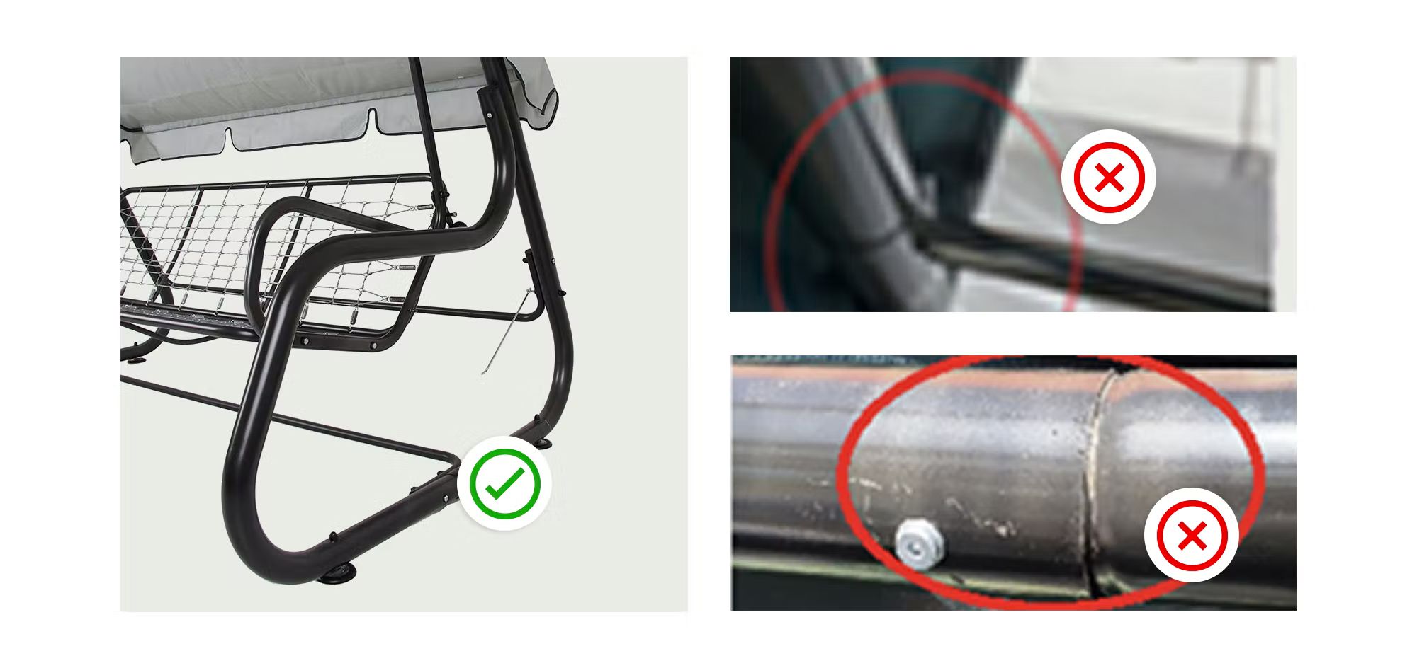 By using long, single-piece elements, we ensure that our garden swings are structurally extremely stable and durable. At the same time, their load capacity can be very high, which is confirmed by actual tests carried out. A "side effect" is also the much greater durability of the frames produced in our Polish plants. The use of short, joined elements for load-bearing pipes, legs, or connecting pipes by many manufacturers is intended to significantly reduce transport costs from distant countries. Connection points weaken and wear out during use. This causes the structure to lose its stability over time, leading to looseness, creaking, and rust.