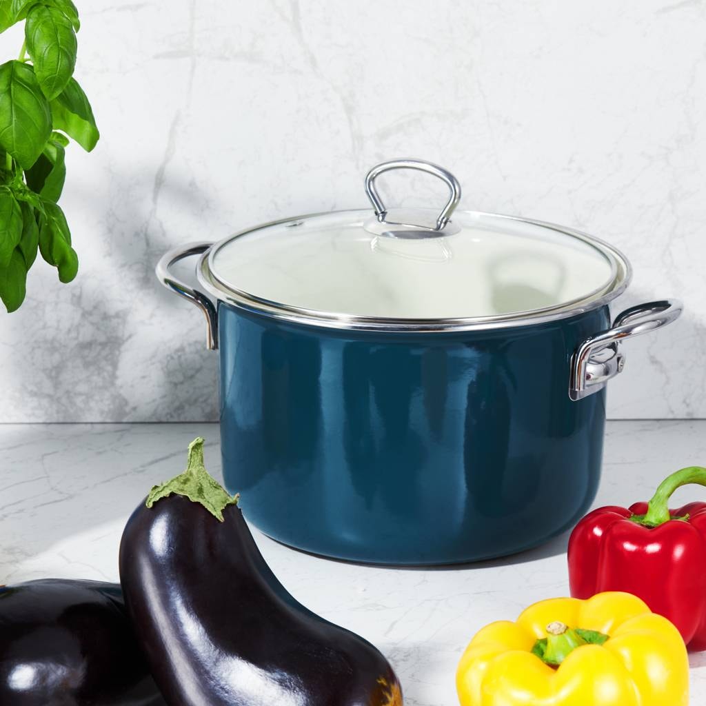 The body is made of steel covered with enamel, thanks to which the vessel is durable and safe in contact with food. This enamelled pot for induction heats up evenly and does not absorb odors or dyes, which makes it easier to keep clean. The matching lid supports cooking control, and the reinforced rim increases resistance to damage during daily use.