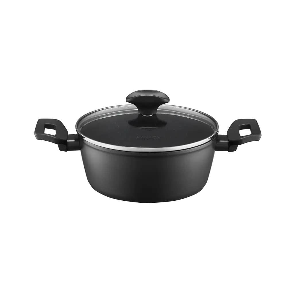 Discover the exceptional quality of our aluminum pot, which was designed with the most demanding users in mind. Careful execution from forged aluminum guarantees its resistance to deformation, which translates into longevity and reliability in daily use. The inner part of the pot is covered with the innovative Qualum Basic Stone Edition coating, which not only prevents food from sticking but also adds an aesthetic appearance thanks to gold-colored particles. The coating is also extremely resistant to abrasion. Ergonomic handles covered with Soft Touch material ensure comfort and safety, enabling a secure grip. The pot for induction is perfect for use on all types of cookers, making it a versatile choice for every cooking enthusiast.